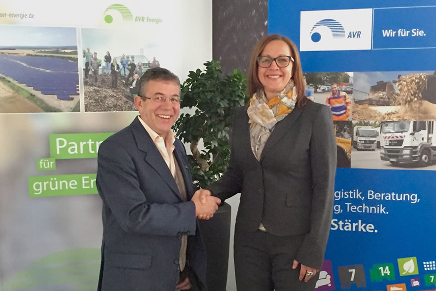 Freuen sich über das gemeinsame Photovoltaik-Projekt und die zahlreichen Synergieeffekte: AVR Energie-Geschäftsführer Peter Mülbaier und die Geschäftsführerin der AVR Kommunal, Katja Deschner